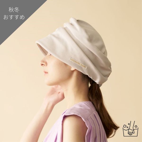 頭皮に直接触れる裏地は、保湿加工をした日本製の綿100%生地を使用。 お肌や髪の毛に含まれる水分は、セラミドという成分によって保たれ、水分を保持することで、皮膚の炎症リスクを軽減します。この自然に含まれるセラミドを特殊な加工で繊維に含ませることにより、肌にやさしいタッチとなり、保湿性と皮膚バリア機能を維持する助けとなります。 肌に刺激の少ない二重ガーゼ組織は、真ん中に空気層ができ、ほどよい保湿性があります。吸放湿性にもすぐれているため、頭の蒸れや乾燥を防ぎ、快適に着用していただける素材です。