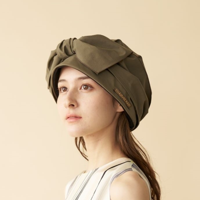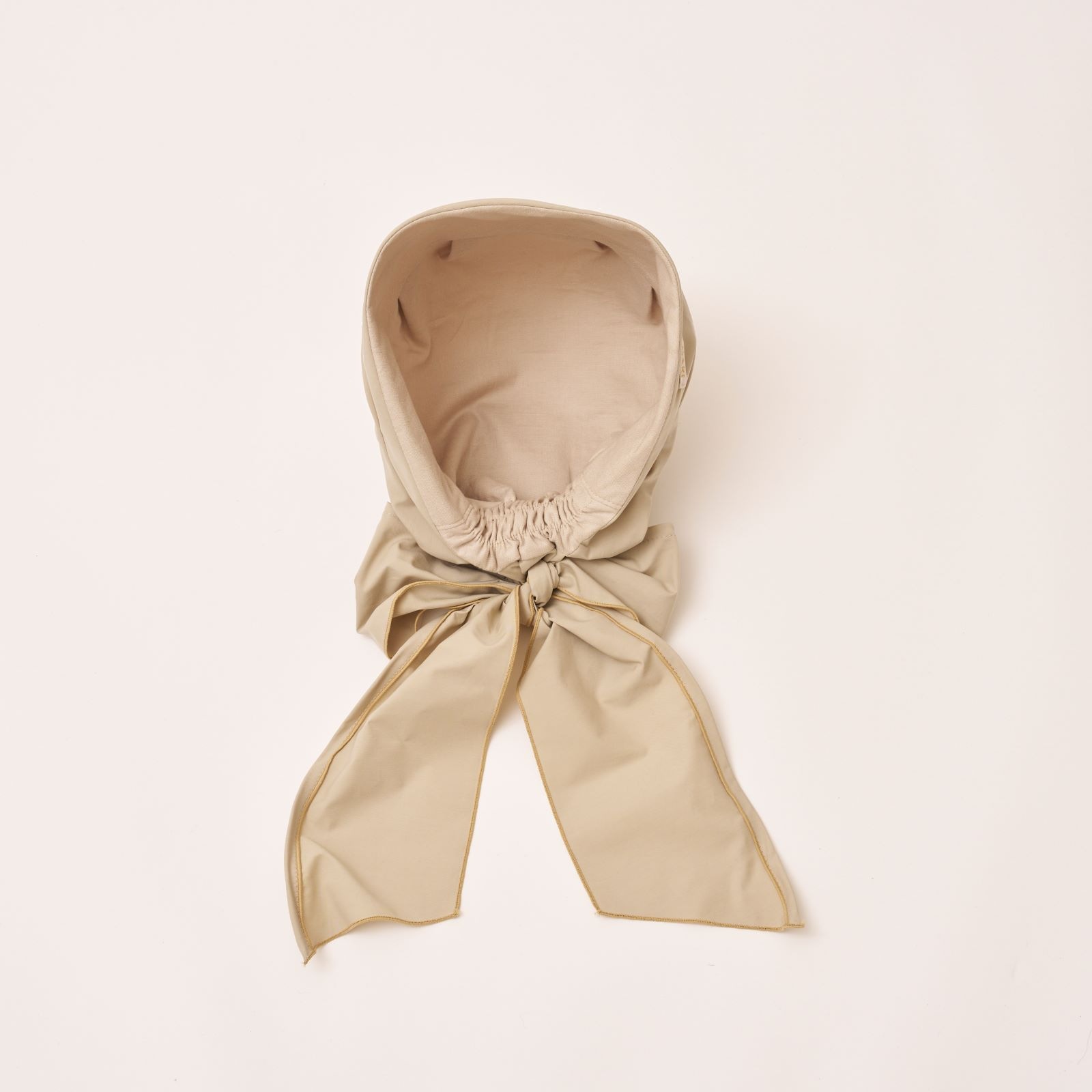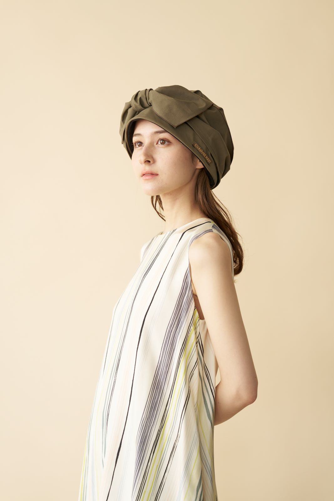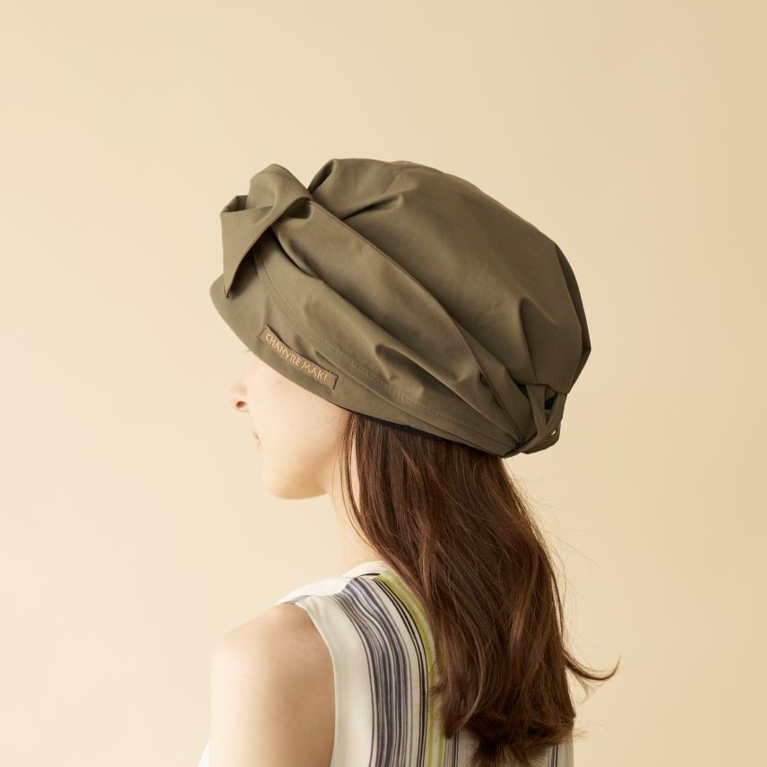 頭皮に直接触れる裏地は、オーガニックコットン100%のダブルガーゼ使用。 ガーゼを2枚重ねているため、厚みが増して、ふんわりとした柔らかいタッチがお肌への負担を軽減します。