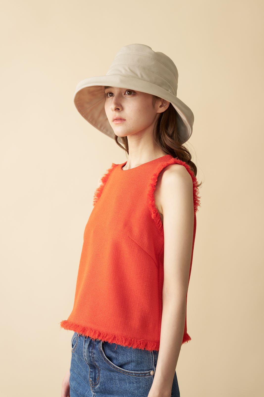 顔周りをカバーしたいときは、つば先を下げると首元まですっぽり隠せます。薄くてとても軽い素材なため、つばが広くても頭に負担がありません。