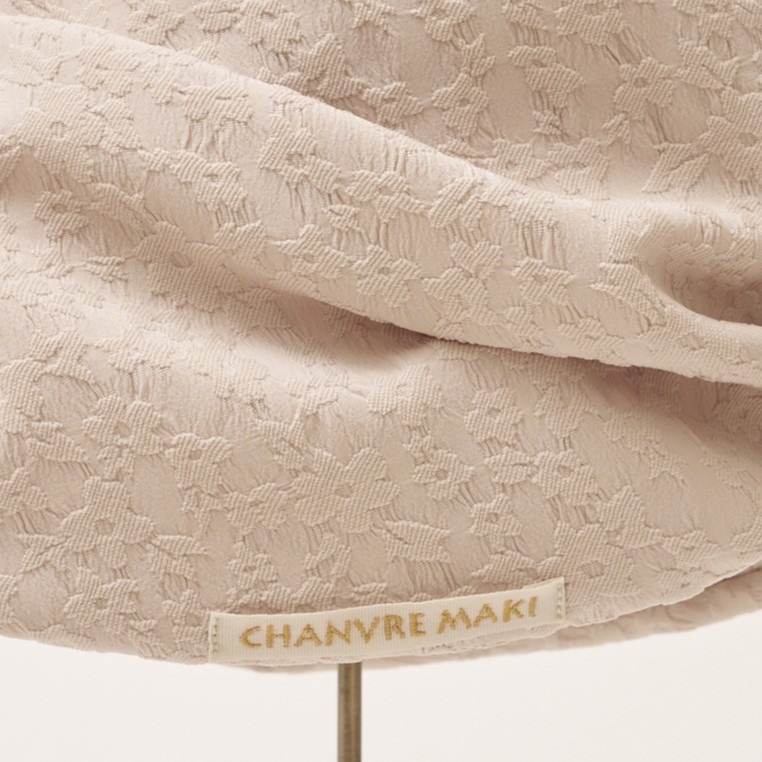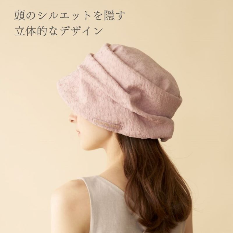 頭皮に直接触れる裏地は、保湿加工をした日本製の綿100%生地を使用。 お肌や髪の毛に含まれる水分は、セラミドという成分によって保たれ、水分を保持することで、皮膚の炎症リスクを軽減します。この自然に含まれるセラミドを特殊な加工で繊維に含ませることにより、肌にやさしいタッチとなり、保湿性と皮膚バリア機能を維持する助けとなります。 肌に刺激の少ない二重ガーゼ組織は、真ん中に空気層ができ、ほどよい保湿性があります。吸放湿性にもすぐれているため、頭の蒸れや乾燥を防ぎ、快適に着用していただける素材です。