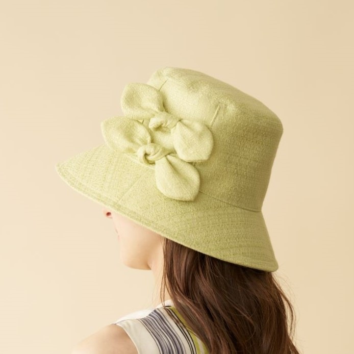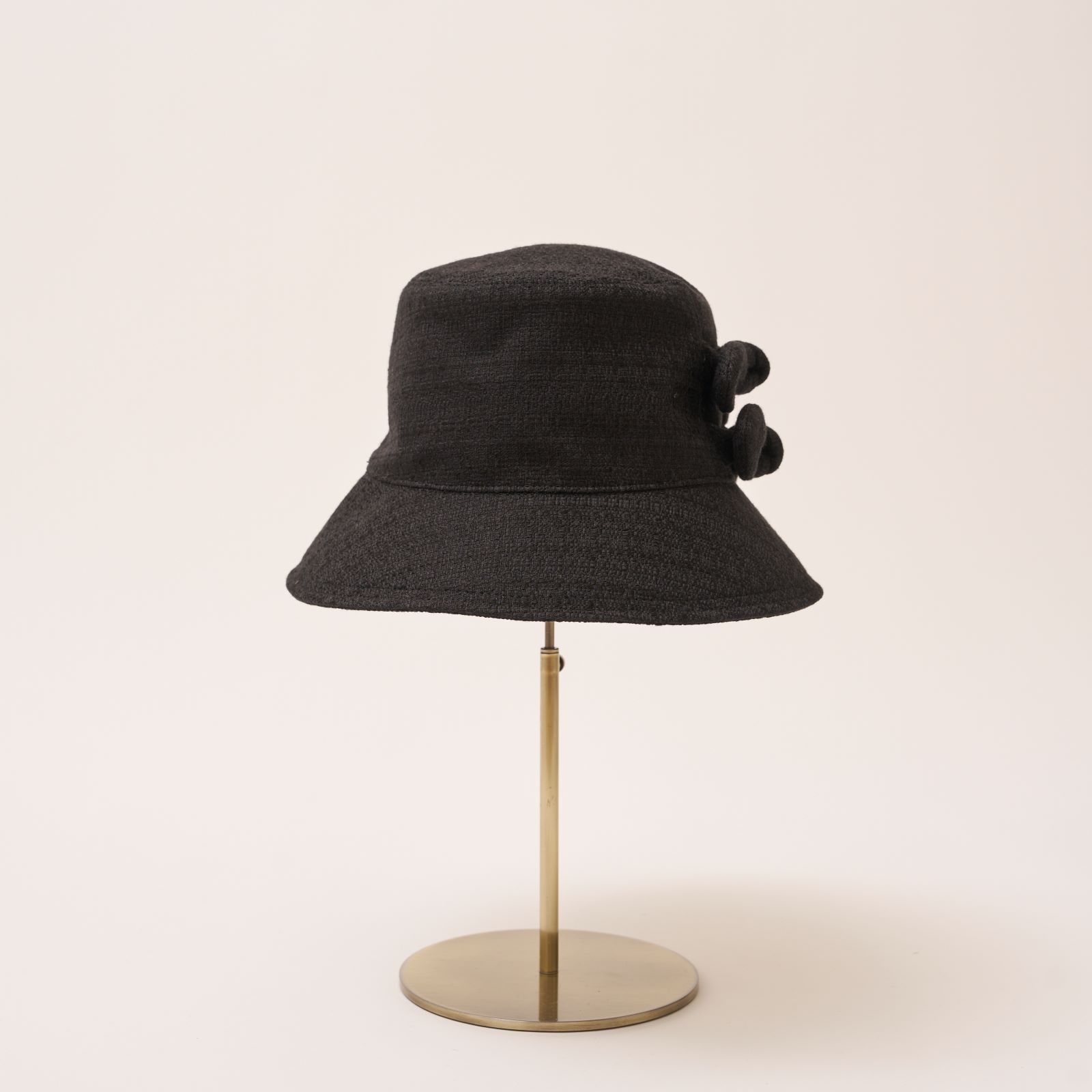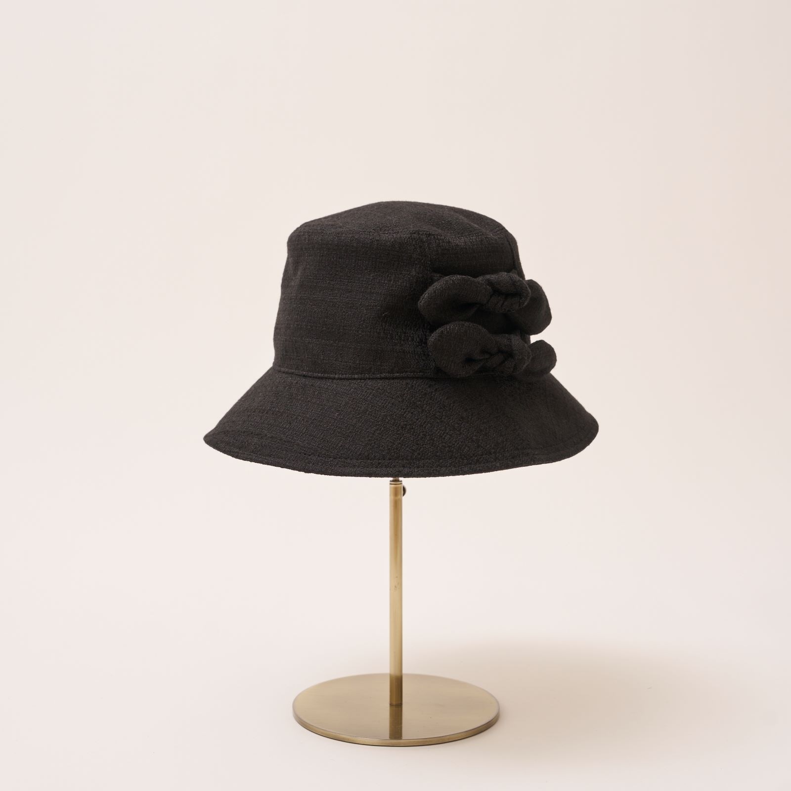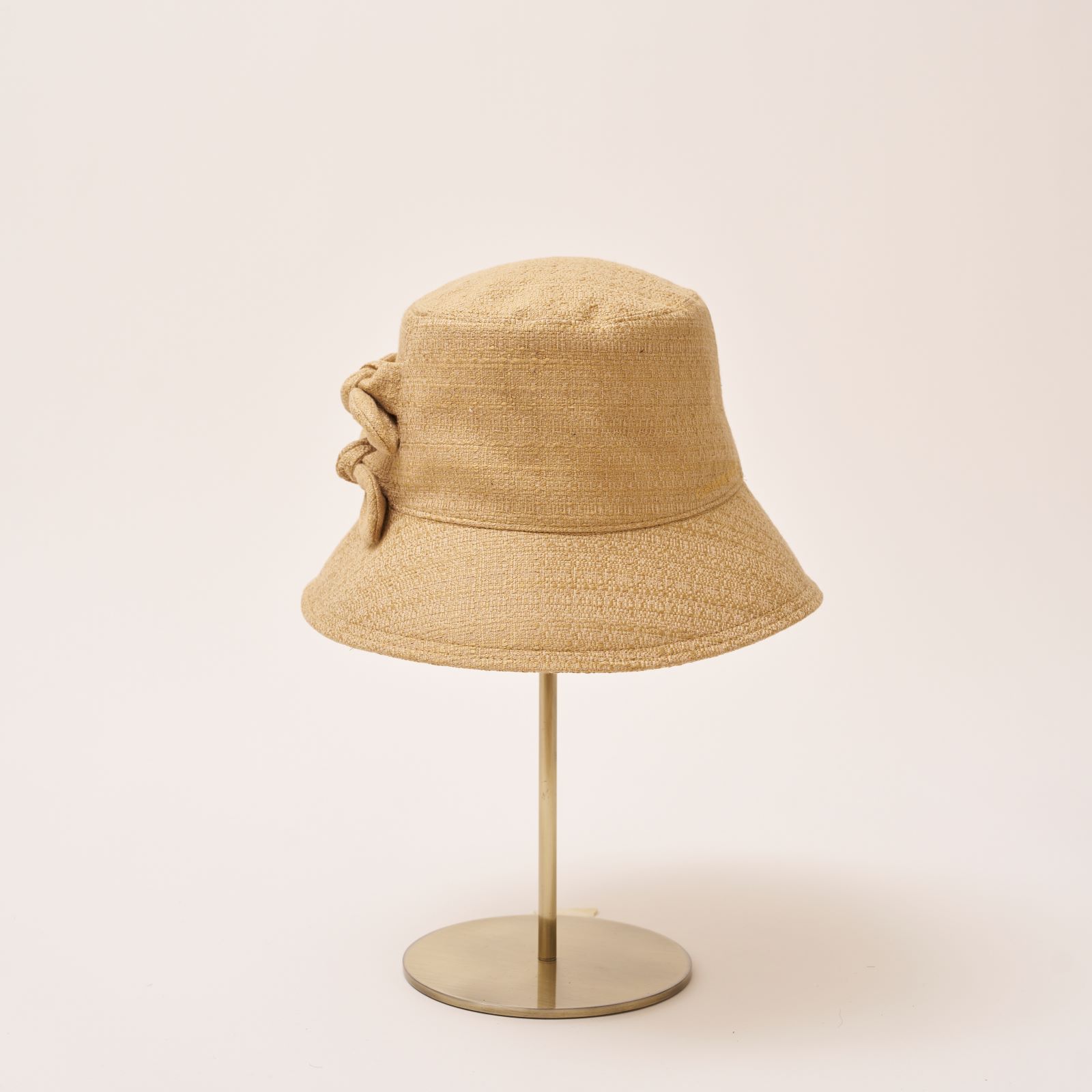 上品なつや感と織りの表情豊かな日本製ツイード生地を使用。クラッシックなツイードにサイドのリボンがワンポイントになる帽子です。
