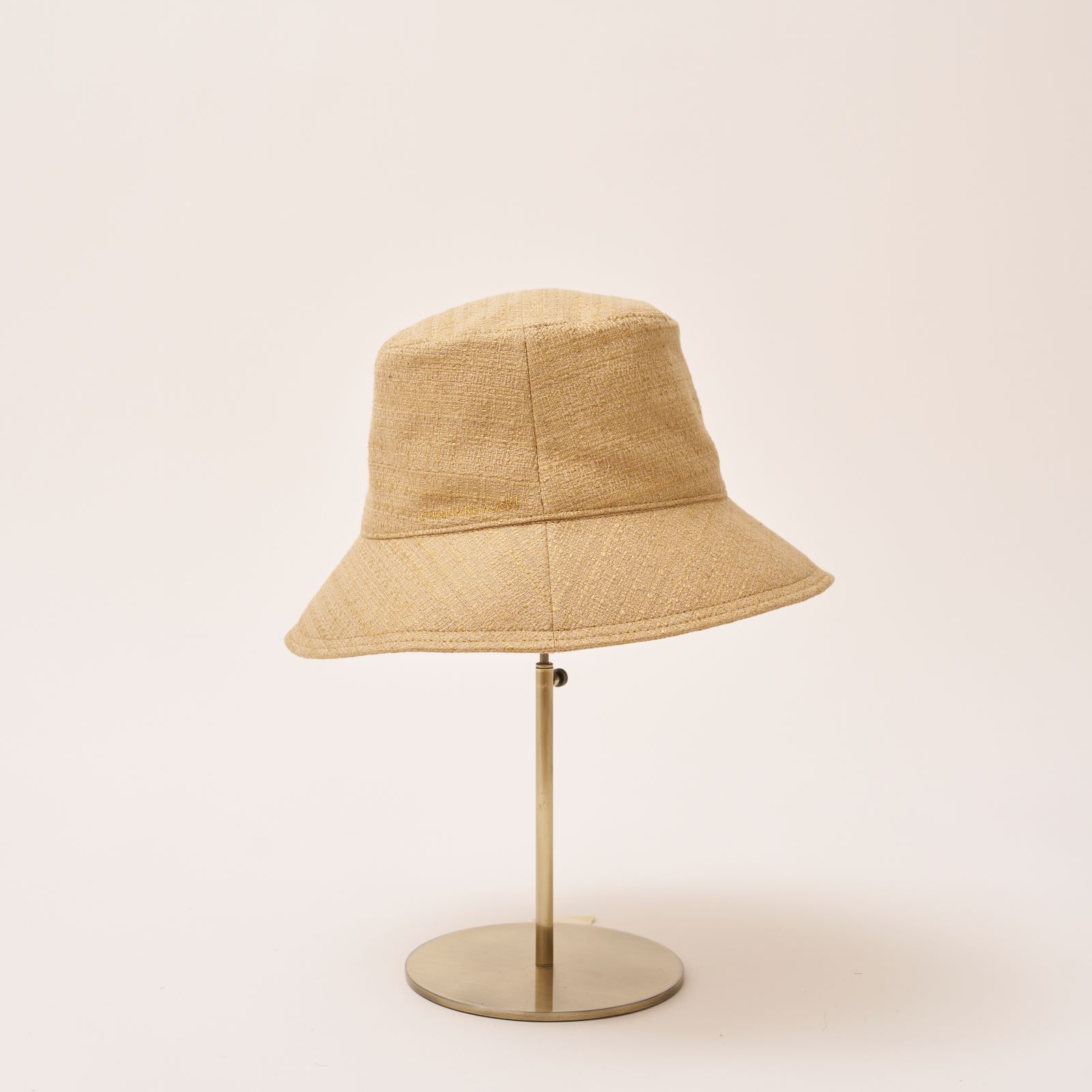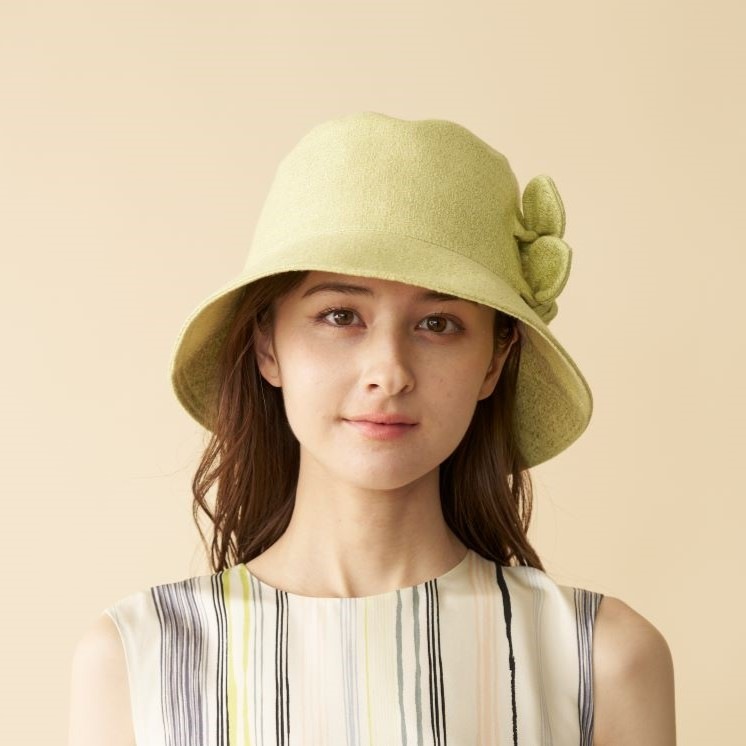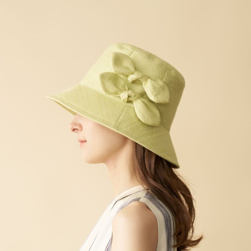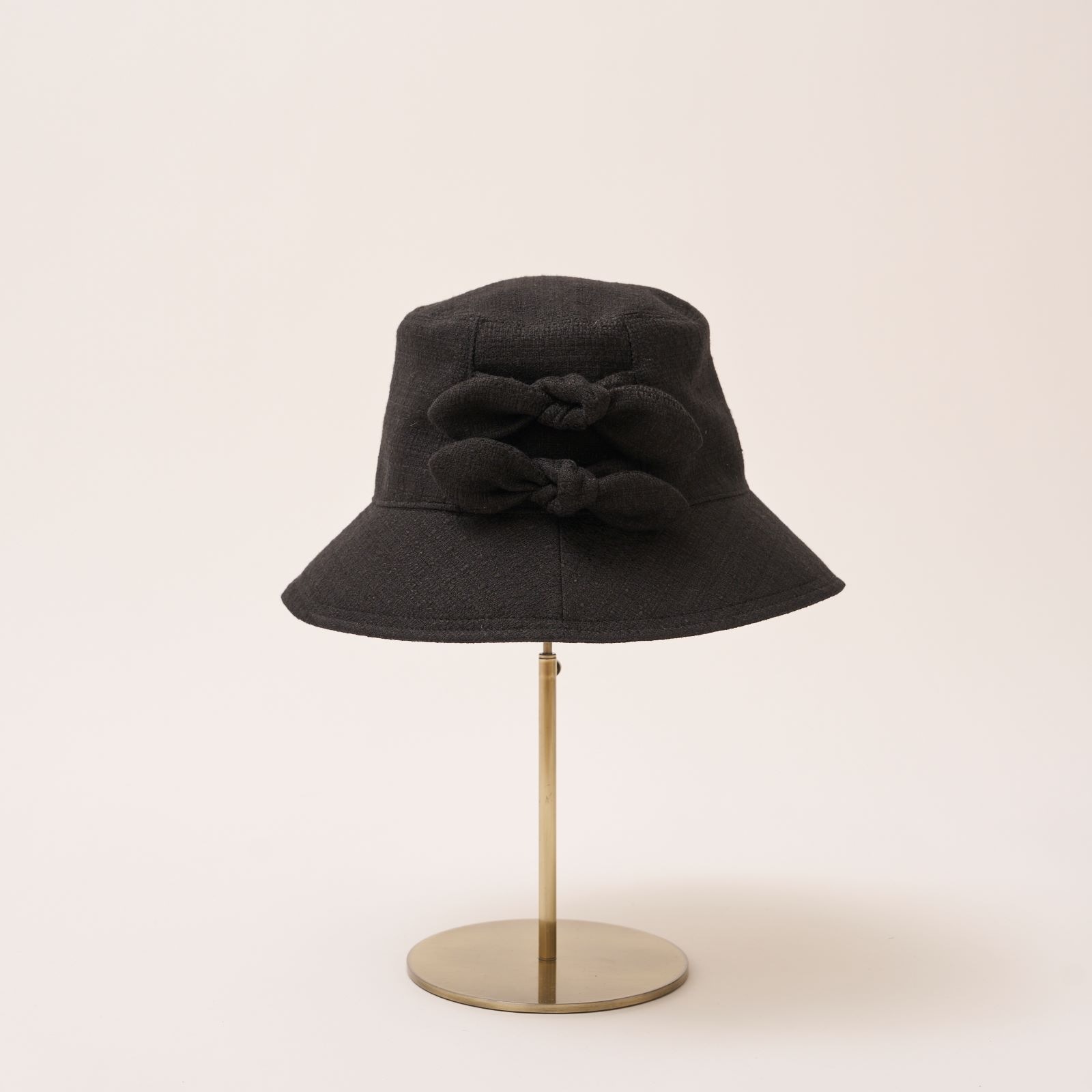上品なつや感と織りの表情豊かな日本製ツイード生地を使用。クラッシックなツイードにサイドのリボンがワンポイントになる帽子です。