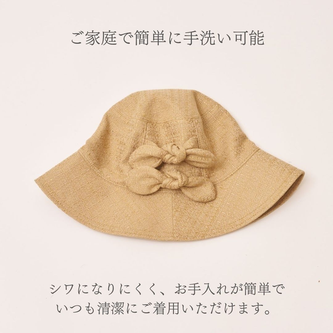 頭皮に直接触れる裏地は、オーガニックコットン100%のダブルガーゼ使用。 ガーゼを2枚重ねているため、厚みが増して、ふんわりとした柔らかいタッチがお肌への負担を軽減します。