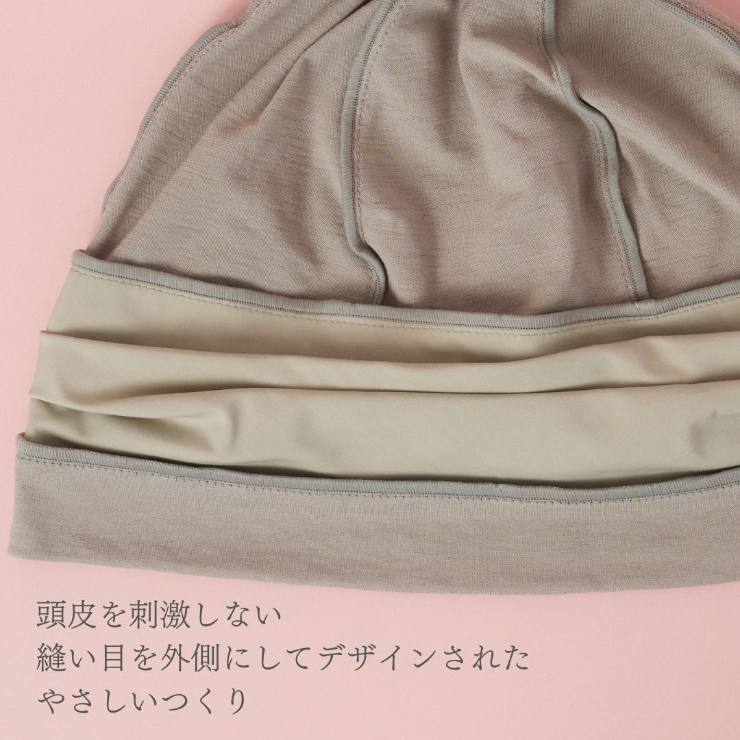 就寝時や室内など、着用頻度が多くなるニット帽。ストレスなく着用できるよう、縫い目を外側にし、頭皮に当たらないことはもちろん、縫い目さえデザインとしても楽しめるように作りました。