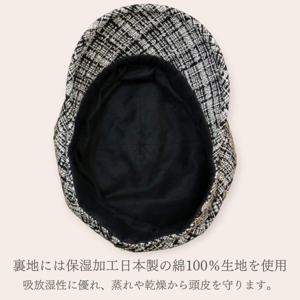 頭皮に直接触れる裏地は、保湿加工をした日本製の綿100%生地を使用。