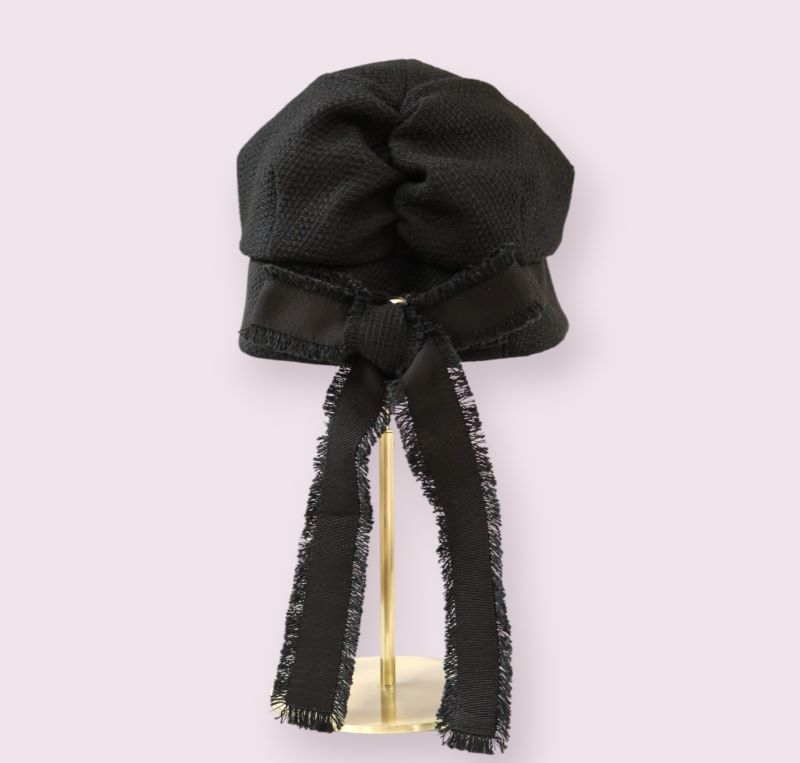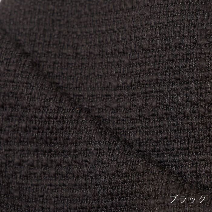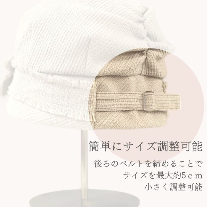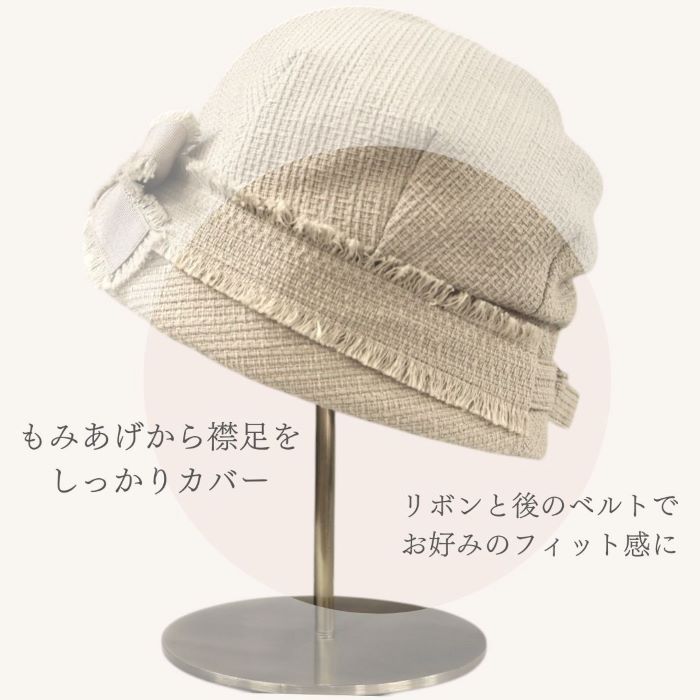 ナチュラルな質感のコットンツイード生地を使用。太番手の糸で織り込んだポコポコとした表情が特徴の生地に、リボンのさりげないフリンジが上品でおしゃれなアクセントに。リボンのアレンジで印象を変えられ、日常からお出かけまで、幅広いシーンでかぶれるデザインです。
